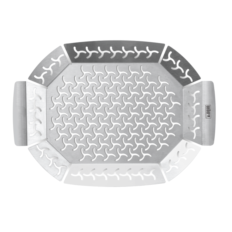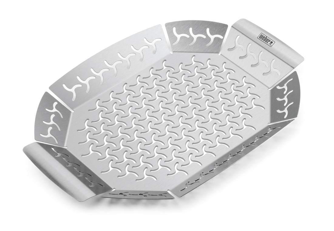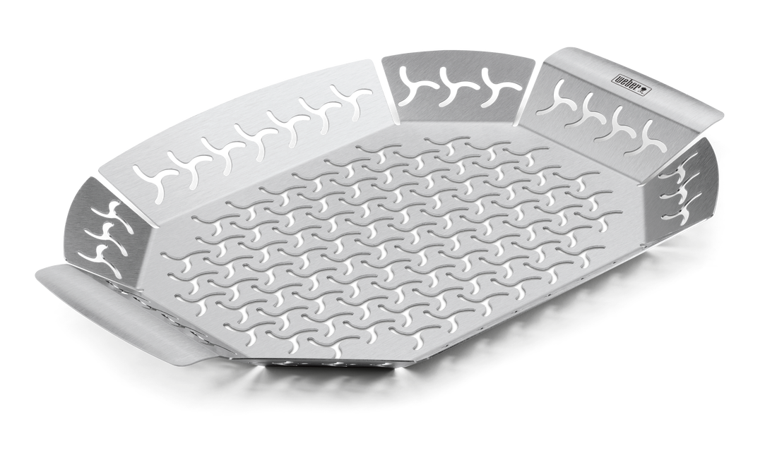 Sauterade, blandade grönsaker, smakrika lökar och morötter, bakade fyllda tomater eller kanske sparris inrullade i bacon! Det finns många olika möjligheter om du vill grilla tillbehör till din läckra stek eller biff – utan att grönsakerna blir alldeles brända eller slaka och tråkiga. Med grönsaksformen från Weber™ får du undan råvarorna något från det heta grillgallret, och hålen i sidorna och botten gör att vätskan från grönsakerna förångas. Den ger dig fler möjligheter vid grillen, så att du verkligen kan briljera och visa att du är en äkta backyard hero!